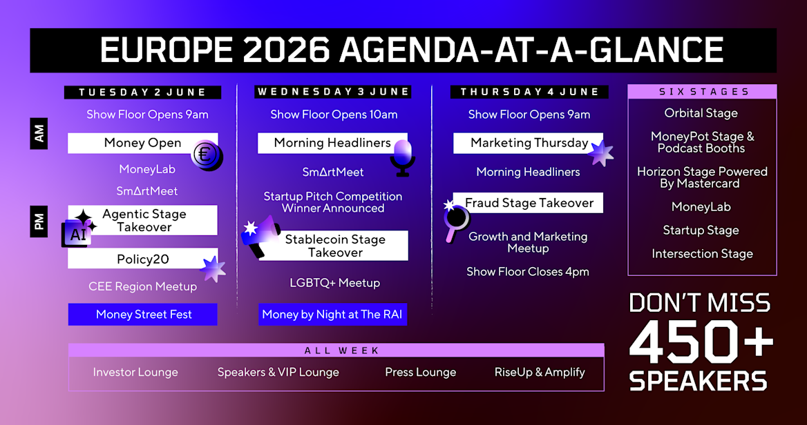 Morning: Kicks off with Money Open on the all-new Orbital Stage, featuring special guests and our iconic opening bell to mark the official start of Money20/20 Europe 2026. We’ll also be opening the doors of MoneyLab, our immersive stage for workshop-style sessions, starting at 10:50 am with David Birch, Simon Taylor, and Nilixa Devlukia as they unpack The 239-Year History of Stablecoins.