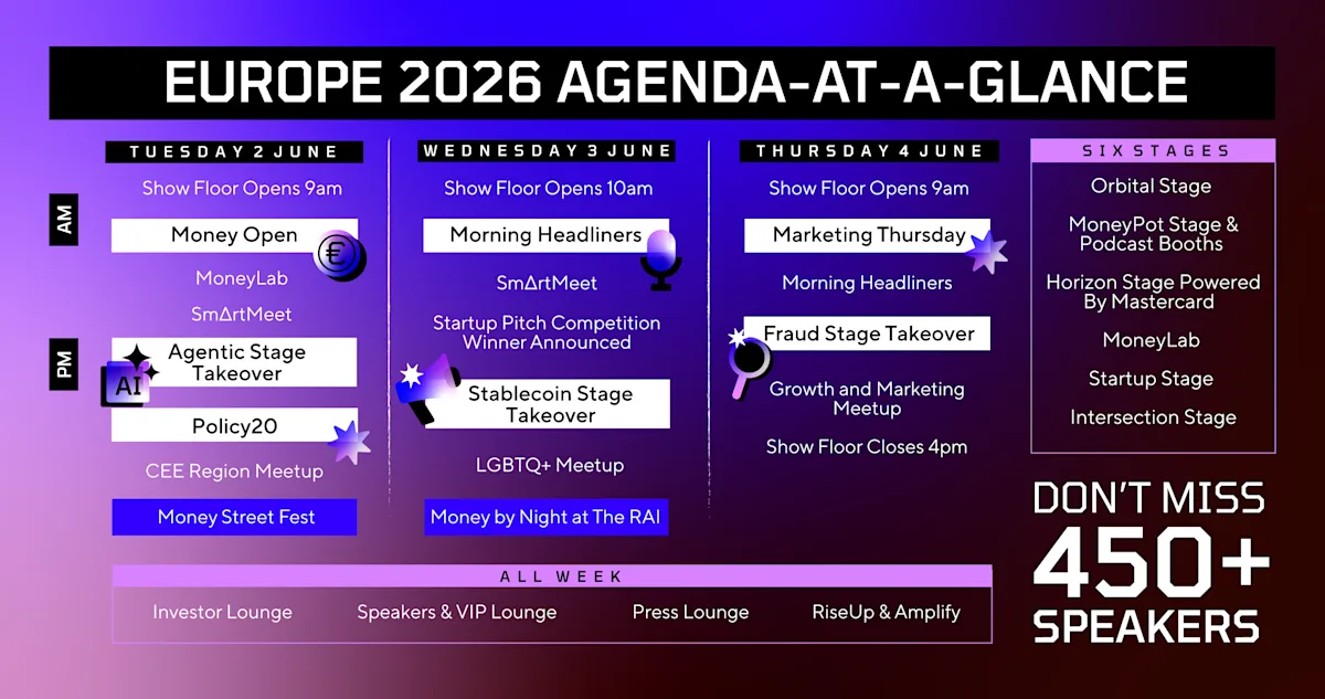 Morning: Day two takes a geopolitical lens to fintech, looking at where politics is impacting the future of money, regulation as a competitive edge, and Europe’s institutional crypto advantage. Our Startup Pitch Competition draws to a close in the morning, so make sure to head to the Startup Stage just after 12:30 pm to find out who takes the trophy.